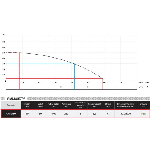Hidrofor IBO AJ50/6024L, 1.1 Kw, debit maxim 60 l/min, inaltime refulare 50 m, rezervor 24 l, racordare teava 1 tol